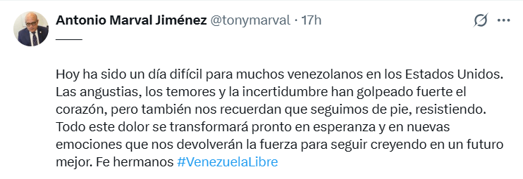 A través de su cuenta en la red social X (@tonymarval), Marval expresó: “Las angustias, los temores y la incertidumbre han golpeado fuerte el corazón, pero también nos recuerdan que seguimos de pie, resistiendo. Todo este dolor se transformará pronto en esperanza y en nuevas emociones que nos devolverán la fuerza para seguir creyendo en un futuro mejor. Fe, hermanos. #VenezuelaLibre”.