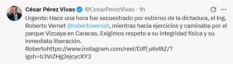 El dirigente político César Pérez Vivas denunció que el ingeniero Roberto Vernet fue secuestrado hace pocas horas por presuntos funcionarios del Estado mientras hacía ejercicios en el parque Vizcaya, en Caracas.