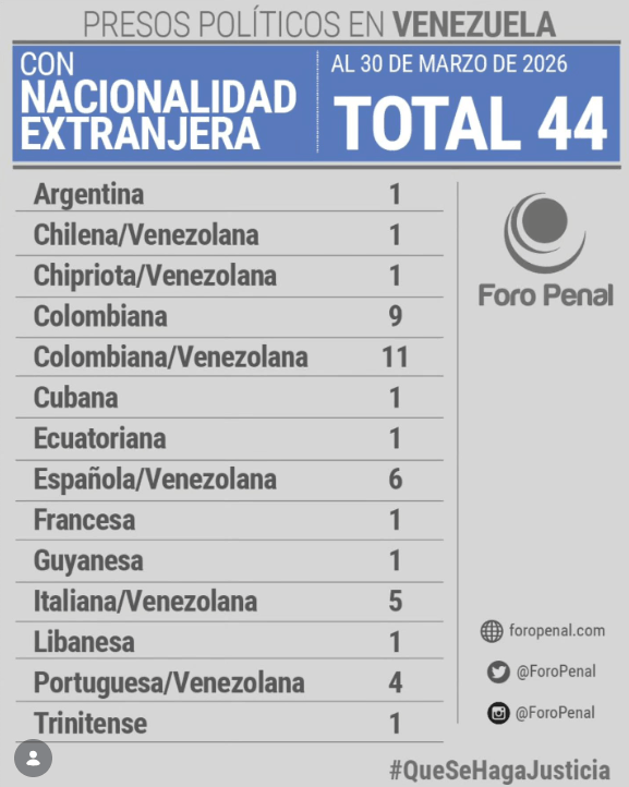 Organizaciones defensoras de derechos humanos alertaron que al menos 44 ciudadanos extranjeros permanecen detenidos por motivos políticos en Venezuela hasta finales de marzo de 2026, en medio de crecientes denuncias sobre el uso de estas detenciones como mecanismo de presión.