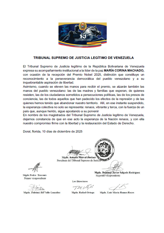 El Tribunal Supremo de Justicia legítimo de la República Bolivariana de Venezuela expresa su acompañamiento institucional a la ciudadana María Corina Machado, con motivo de la concesión del Premio Nobel de la Paz 2025, distinción que exalta su liderazgo y reconoce la perseverancia democrática del pueblo venezolano y su firme aspiración de libertad.