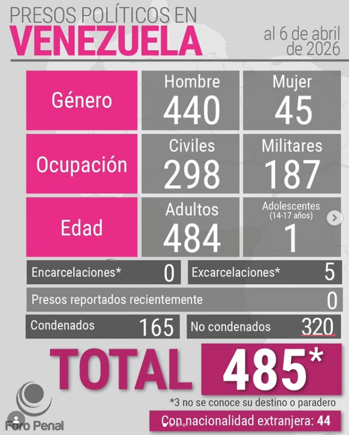 La organización no gubernamental Foro Penal informó que en Venezuela hay 485 presos políticos hasta el 6 de abril de 2026, una cifra que evidencia que la crisis de derechos humanos en el país continúa sin resolverse pese a recientes medidas oficiales.