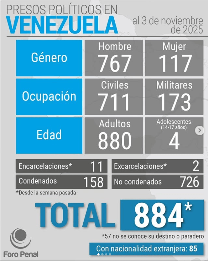 El Foro Penal contabilizó 884 presos políticos en Venezuela, de los cuales 57 permanecen desaparecidos, según el más reciente informe presentado este sábado por la organización defensora de derechos humanos.