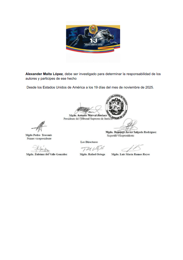 Finalmente, el TSJ en el exilio reafirmó su compromiso con la justicia y enfatizó que ningún acto de violencia ni de intimidación detendrá su labor, instando a que se determine la responsabilidad de todos los implicados en el ataque contra Alexander Maita López.