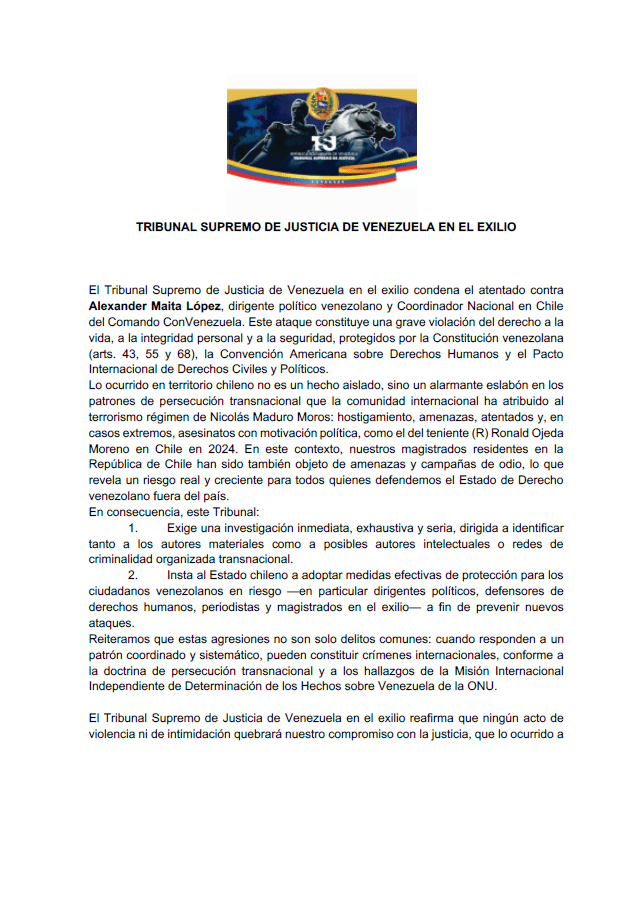 El Tribunal Supremo de Justicia de Venezuela en el exilio emitió un contundente pronunciamiento condenando el atentado perpetrado contra Alexander Maita López, dirigente político venezolano y Coordinador Nacional en Chile del Comando ConVenezuela. Según el tribunal, el ataque constituye una grave violación de los derechos a la vida, la integridad personal y la seguridad, consagrados en la Constitución venezolana, la Convención Americana sobre Derechos Humanos y el Pacto Internacional de Derechos Civiles y Políticos.