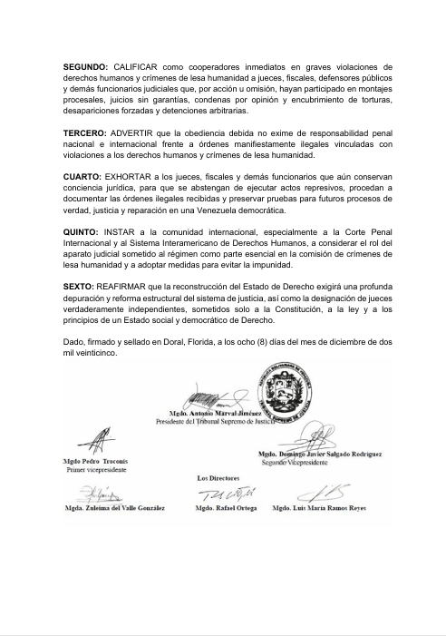 El pronunciamiento advierte que la reconstrucción del Estado de Derecho, tras la salida del régimen, requerirá “una profunda depuración, reestructuración y reforma integral del sistema judicial”, con el fin de restablecer la independencia, la legalidad y las garantías constitucionales en el país.