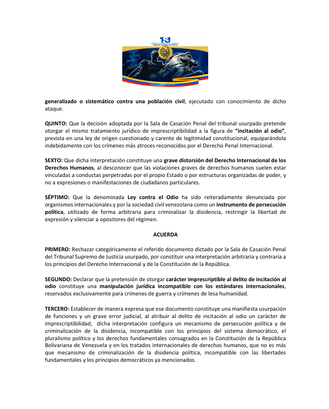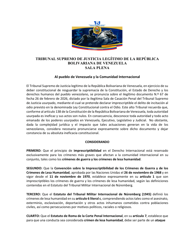 El Tribunal Supremo de Justicia legítimo de la República Bolivariana de Venezuela expresó su rechazo categórico al documento N.º 67, emitido el 26 de febrero de 2026 por la Sala de Casación Penal del denominado tribunal usurpado, que pretendía declarar imprescriptible el delito de incitación al odio previsto en la Ley contra el Odio.