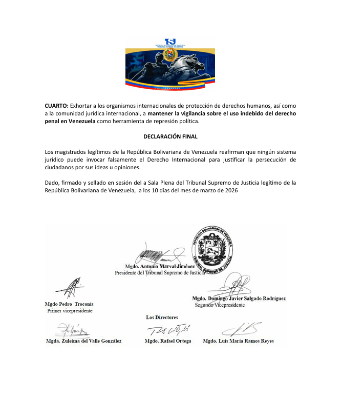 Finalmente, el TSJ legítimo exhortó a organismos internacionales y a la comunidad jurídica global a mantenerse vigilantes frente al uso del derecho penal como instrumento de represión política en Venezuela.